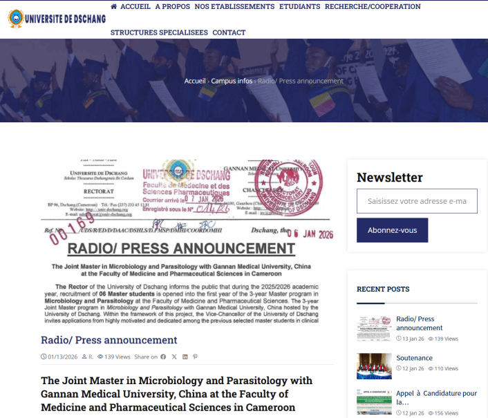 Recently, our university and the University of Dschang in cooperation with the University of Dschang in Cameroon officially launched the enrollment of the joint master's degree training program of "Pharmacy" and "Microbiology and Parasite Science". This is the first joint master's project of our university to study in China for education. This project is a substantial measure jointly promoted by the ...