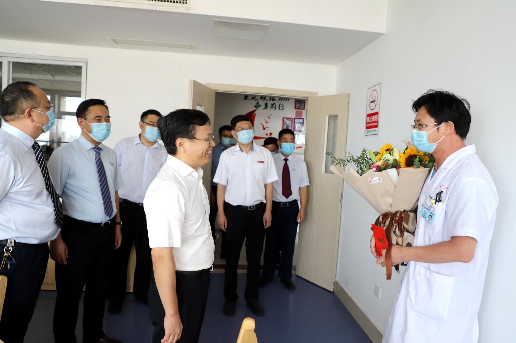 On August 19, Li Gongjin, the Secretary of GMU Party Committee, went to FAHGMU in the Huangjin Area to visit the representatives of doctors working on the front line of clinical practice, which he presented the flowers and bonus to them and thanked them for their dedications and extended congratulations to all medical workers of GMU. Li Gongjin communicated with the representatives and encouraged them to give priority to morality, skill, research and teaching. Vice-President Zhang Xiaokang and the leaders of GMU Party Committee Office and FAHGMU accompanied the visit.