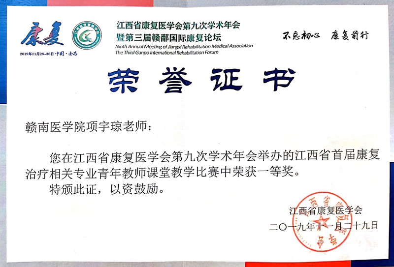 On November 29, hosted by Jiangxi Rehabilitation Medical Association, the 1st Class Teaching Competition for Young Teachers of Rehabilitation Treatment Majors (CTCYTRTM) was held in Nanchang. After fierce competition, Xiang Yuqiong, a teacher of the School of Rehabilitation (SR) of GMU, won the first prize with the highest score in the total score. SR dean Wen Xianhao won the honorary title "The Excellent Instructor".