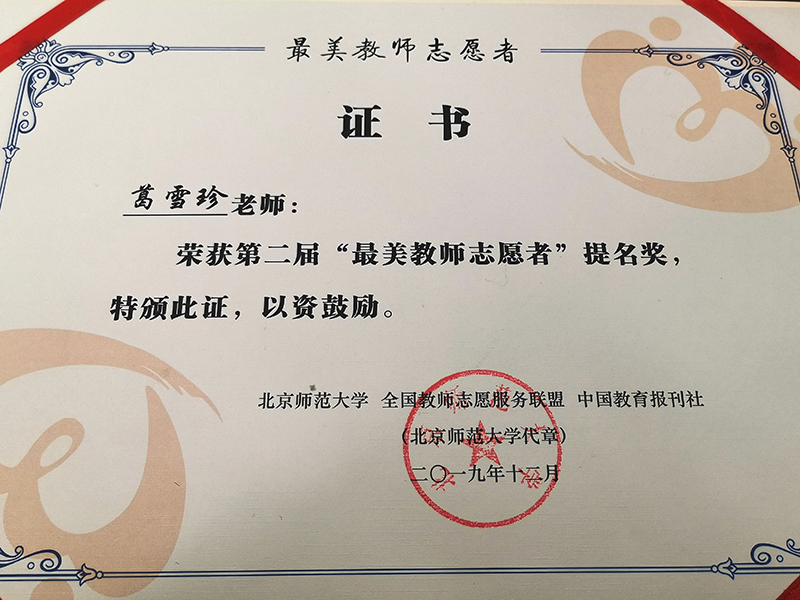 It is known that under the guidance of the Ministry of Education and the China Federation of Volunteer Service, Beijing Normal University, the National League of Teachers' Volunteer Service and the China Press, 10 teachers were selected as the 2nd Most Beautiful Teachers Volunteers and 5 teams the Most Beautiful Teachers Volunteer Service Teams. 10 teachers won the Most Beautiful Teachers Volunteers Nomination Awards.