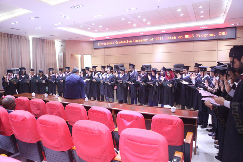On June 10, the provisional ceremony for international students of Batch 2014 was held in Golden Campus. Ye Junming, GMU Vice-President, the relevant functional departments’ directors, the deans, and representatives of Chinese and foreign teachers, attended the ceremony. All the teachers and students of the School of International Education (SIE) attended the ceremony. The ceremony started with the loud school song of teachers and students.