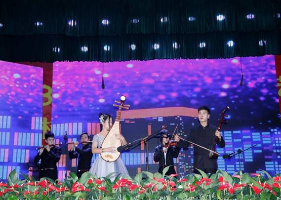 The instrumental music strings performances from the Classical Music Association, the Show "Silk Road Vientiane" from the School of International Education and the short sketch "Brothers” from School of Rehabilitation were staged successively, enjoying cheerful laughter on the spot and peaks of applause.