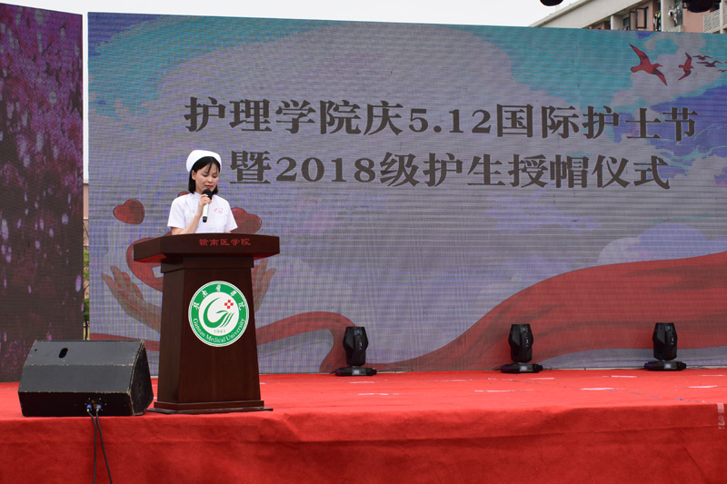 On the afternoon of May 11, in order to welcome the 108th International Nurses’ Day, the School of Nursing (SN) held a ceremony celebrating International Nurses' Day and capping nursing students of Batch 2018 in Huangjin Campus. The senior nurses of Ganzhou Nursing Society, the directors of nursing departments and head nurses of hospitals in Ganzhou, and the representatives of excellent nurses were invited to give caps to all Batch 2018 nursing students.