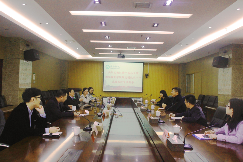On the afternoon of April 12, Zhou Zhigang, the Dean of International Education School of Jiangxi University of Traditional Chinese Medicine (JUTCM), and his delegation visited GMU. Huang Dong, the Dean of the School of International Education of GMU, and Zhong Fuyou, the associate dean, attended the meeting.