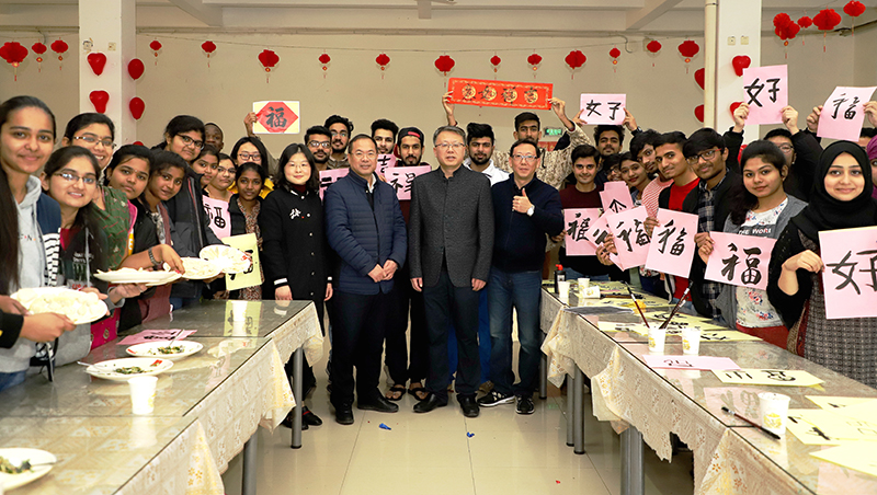 GMU Vice-President Liu Min, Ye Junming and the heads of relevant departments jointly celebrate the Spring Festival of 2019 with all foreign teachers and students. Teachers and students make dumplings and write fortune letters to feel the strong traditional Chinese culture and the festive atmosphere of the Spring Festival.