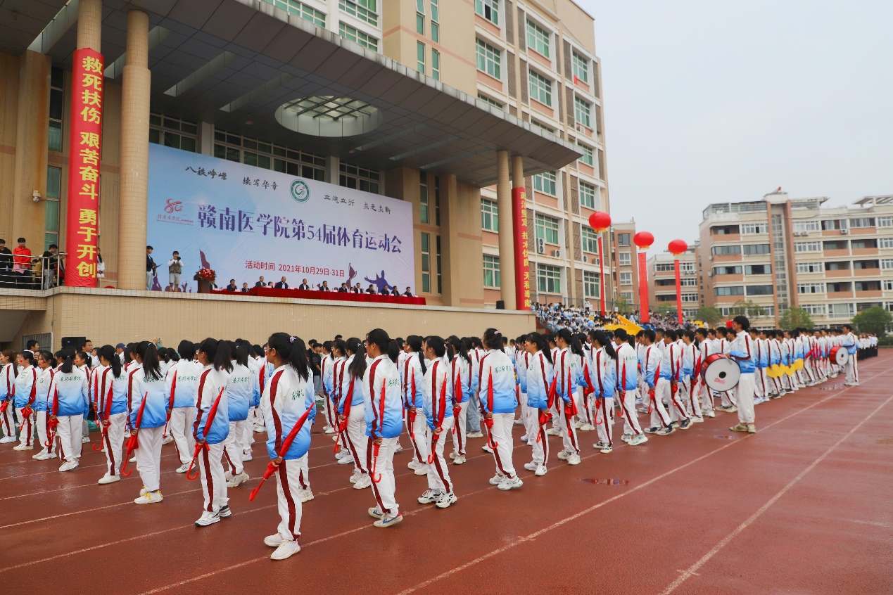 At 8 o'clock, accompanied by loud sports tunes, the guard of honor, dressed in solemn and square gowns, lined up in a neat and uniform formation, entered the stage with sonorous and forceful steps, and kicked off the entrance. Afterwards, the School of Basic Medical Sciences (SBMS), the School of Nursing (SN), School of Humanities & Social Sciences (SHSS), the School of Rehabilitation (SR), the School of Pharmacy (SP), the School of Medical Information Engineering (SMIE), the School of Marxism (SM), the School of Public Health and Healthcare Management (SPH), the School of General Practice Medicine(SGPM), the Administration Organs, the School of the Third Clinical Medicine (STCM), the School of the Second Clinical Medicine (SSCM),the School of the First Clinical Medicine and other representatives, lined up neatly, chanting majestic slogans and passed the rostrum one by one. They were energetic, and performed various talent shows in front of the rostrum. The performances were either fashionable, vigorous, vigorous, or skilled, winning peaks of applause.
