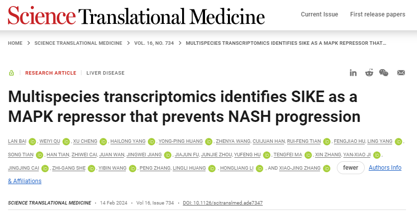 On February 15, the National Key Laboratory of Major Disease New Drug Target Development and New Drug Creation of GMU published its latest research findings online in the international authoritative journal Science•Translational Medicine (Impact Factor 17.1), titled "Multispecies Translatomics Identities SIKE as a MAPK Reporter That Prevents NASH Progress", expositing that "SIKE" is a new key therapeutic target for Nonalcoholic Fatty Liver Disease (NAFLD). The corresponding authors of this academic paper are Professor Li Hongliang from the Gannan Institute of Innovation and Translational Medicine of GMU, as well as Professor Zhang Xiaojing, Huang Lingli, Bai Lan, Cheng Xu, Yang Hailong, etc.