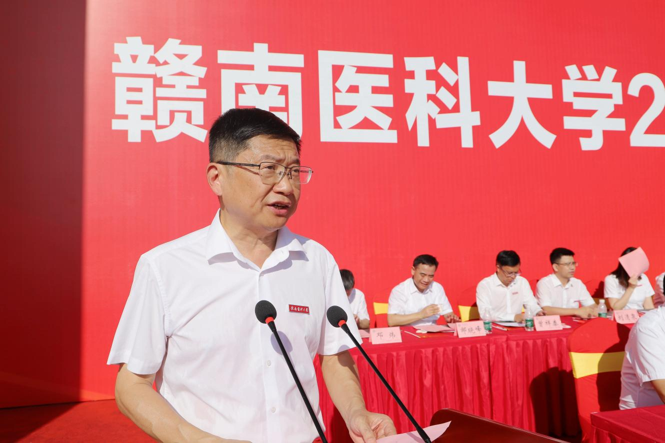 Zhang Xiaokang, Secretary of the Party Committee and President of GMU, attended the ceremony and delivered a speech. Members of the Party Committee of GMU, including Liao Wei, Ye Junming, Peng Weijie, Sheng Yaohuan, Liao Zhiping, Lai Chuanjing, and Xu Huaping, attended the ceremony and took their seats on the rostrum. Huang Ruizhong, Deputy Secretary of the Party Committee of GMU, presided over the ceremony.
