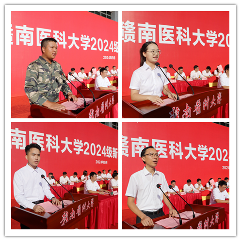 Lai Zhubin Yun, a representative of the Batch 2024 undergraduate freshmen and Class 1A of the Batch 2024 Clinical Medicine Science (General Practice) at the School of General Medicine, Liang Luwen, a representative of the Batch 2024 graduate freshmen and a Master's degree student in Clinical Medicine Science at the School of the First Clinical Medicine Science (SFCMS), Xu Shiyun, a student representative and Class 2 of the Batch 2021 Clinical Medicine Science at the SFCMS, and Ding Yechun, a teacher representative and associate dean of the School of Pharmacy (SP), delivered a speech successively.