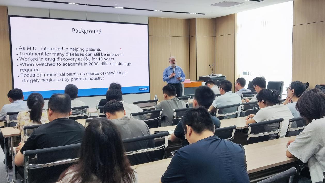 On the morning of June 10, Professor Walter Luyten, a distinguished pharmacologist, biologist, and PhD supervisor from KU Leuven (Belgium), was invited to deliver a special academic report titled "Bioactive Natural Products from Plants" at the 14th Pharmaceutical Sub-forum of the Rongjiang Forum. Over 100 faculty members and student representatives from the School of Pharmacy, research centers, and related disciplines attended it.