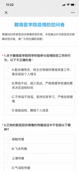 The Test questions were sent to students’ We-chat Groups in the form of questionnaire, encouraging all students to take part in and comprehensively master the knowledge about the COVID-19. There were 20 multiple-choice questions in total in 10 minutes, covering 100 full marks. Nearly 11,000 students participated.