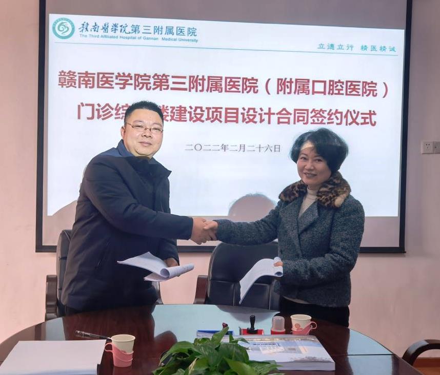 On February 26, the signing ceremony of the Design Contract of the Outpatient Administration Building Construction Project (DCOABCP) of the Third Affiliated Hospital (Stomatological Hospital) of GMU (TAHGMU) was held in the hospital conference room. Liao Min, Luo Xiaolin, Liu Xiaochun, heads of relevant functional departments and relevant heads of the winning bidder Jianhuacheng Engineering Technology Group Co., Ltd. attended the ceremony.