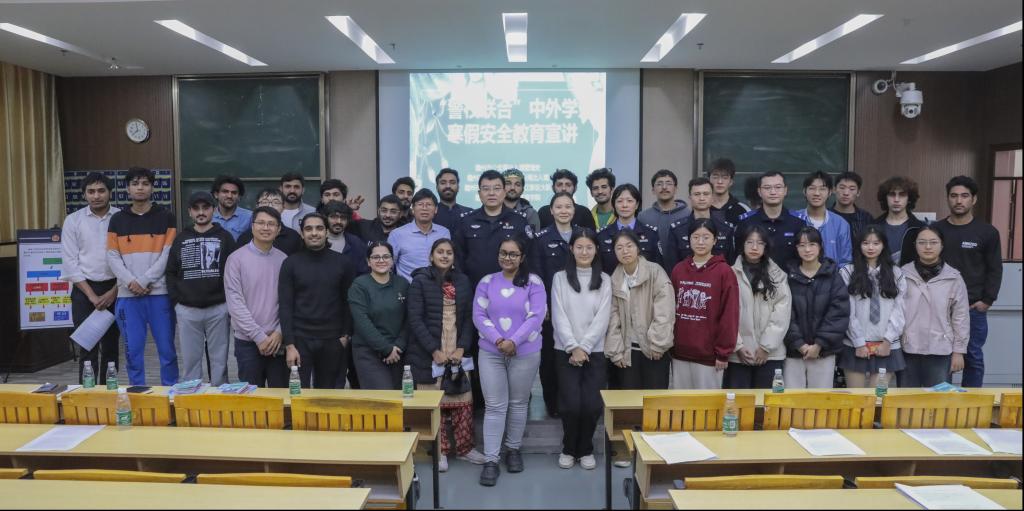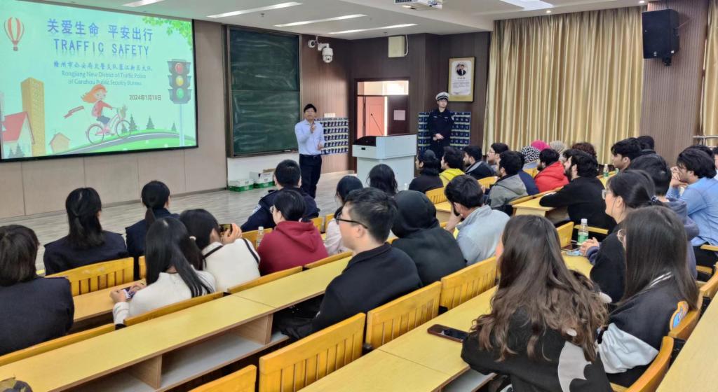 On the afternoon of January 18, the International Education College (IEC) of GMU invited relevant police officers from the Exit-Entry Management Office of Ganzhou Public Security Bureau, the Exit-Entry Branch of Rongjiang District of Ganzhou Public Security Bureau, and the Traffic Police Detachment of Rongjiang District Brigade of Ganzhou Public Security Bureau to hold the Winter Vacation Safety Lecture Activity for Chinese and International Students of GMU under the theme of “Police-GMU Cooperation” in classroom 508 of the second teaching building. IEC Associate Dean Zhong Fuyou presided over it.