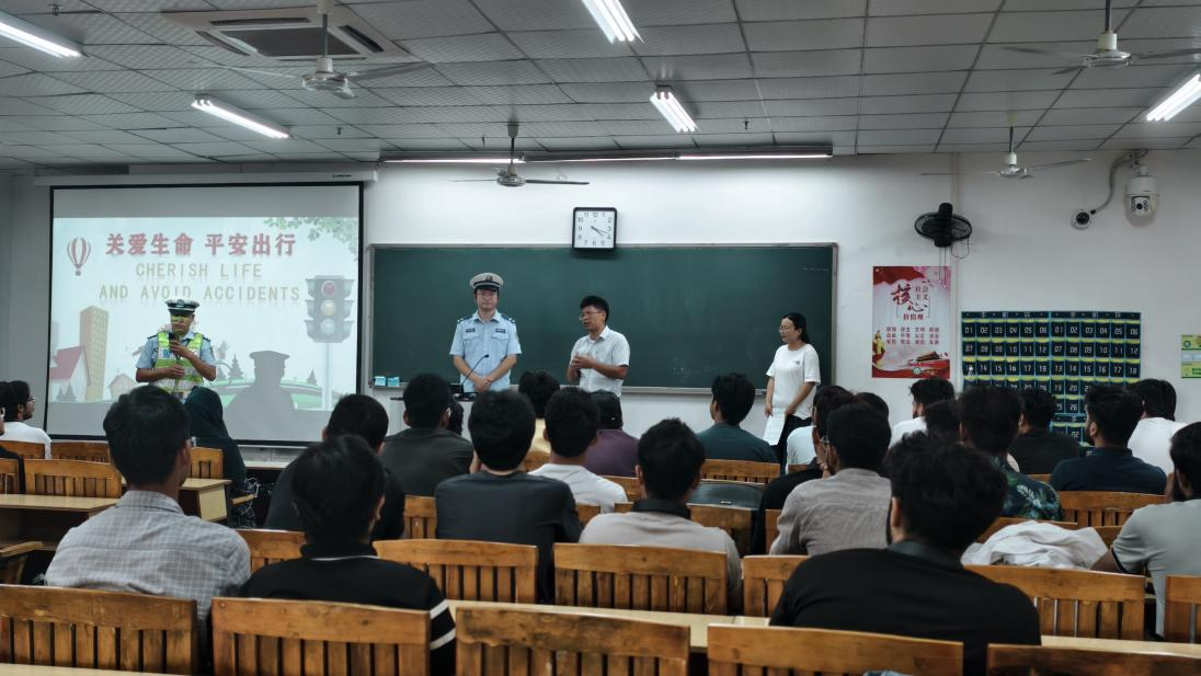 In order to effectively improve the traffic safety awareness of international students and build a strong campus safety defense line, on October 13, the Institute of International Education and the traffic police department of Rongjiang New District jointly held a rich traffic safety lecture. Zhong Fuyu, vice dean of the School of International Education, international student management teachers and international students of the college participated in this lecture.